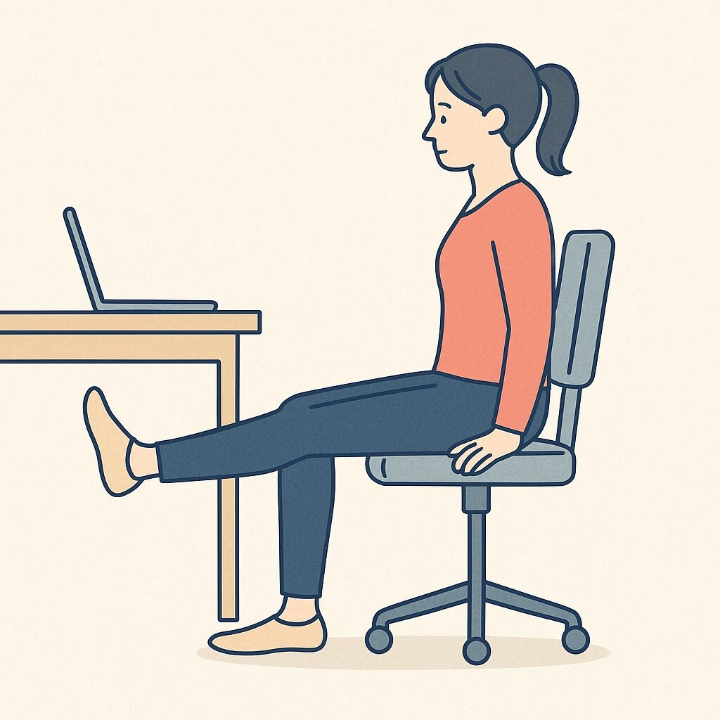 Sit tall, straighten one leg out in front of you, hold for a few seconds, then lower it back down. Alternate legs. This keeps your legs engaged and improves circulation without leaving your chair.