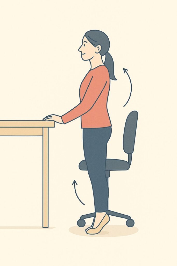 Stand behind your chair, rise up onto your toes, hold, and lower back down. Repeat several times to boost circulation and wake up tired legs.