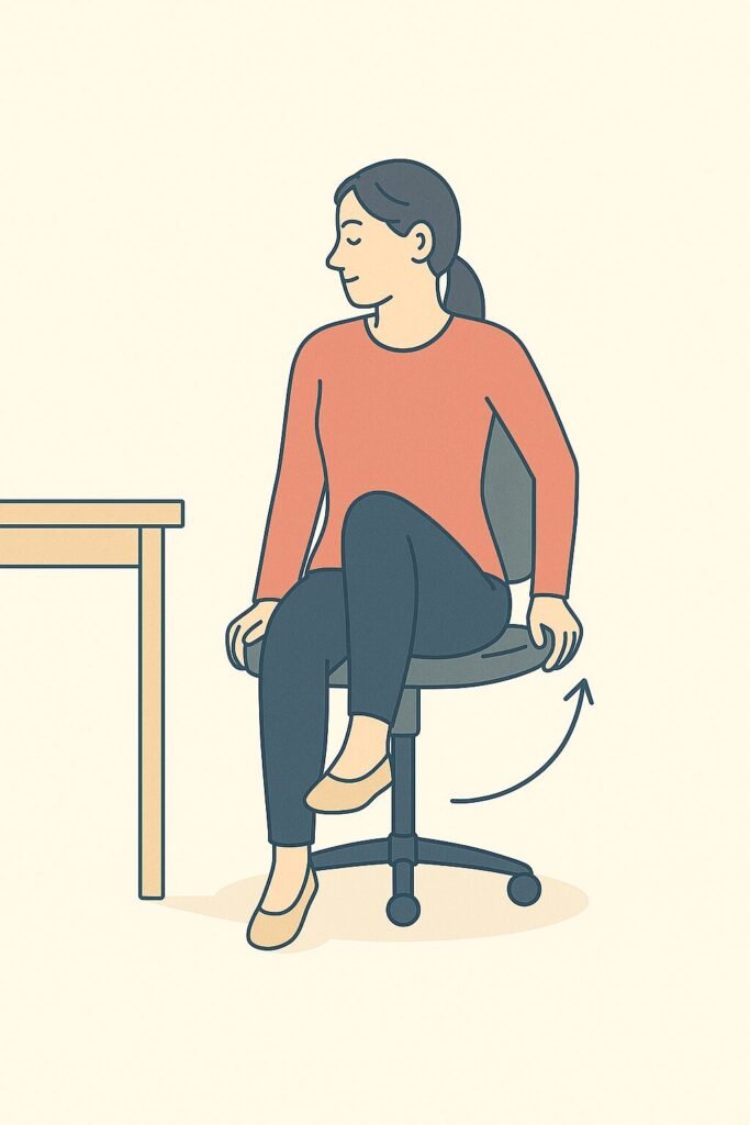 With your feet flat on the ground, gently twist your torso to the right and hold, then twist to the left. This helps loosen your spine and relieve lower back pressure.