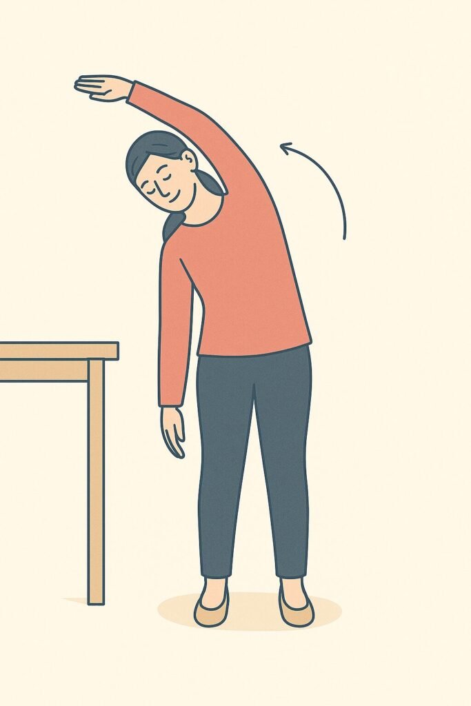Stand tall, raise one arm overhead, and lean gently to the opposite side. Switch sides. This opens up your torso and helps you breathe more deeply.